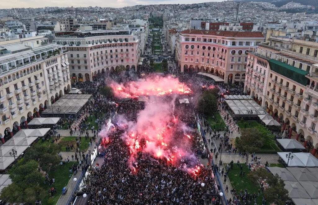 19:26: Χιλιάδες κόσμου έβαλαν φωτιά στην πλατεία Αριστοτέλους για τα 100 χρόνια του ΠΑΟΚ