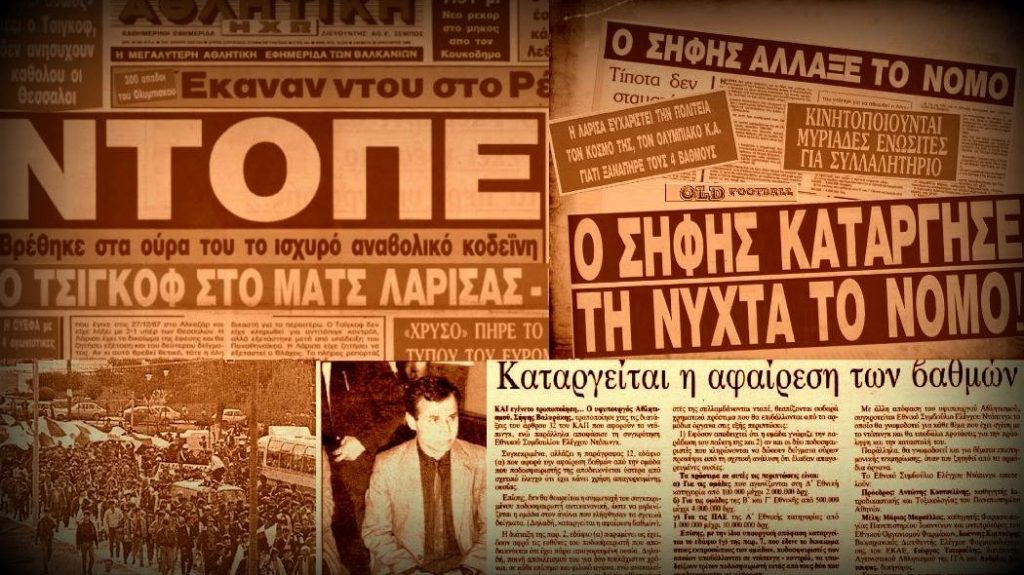 Αιτία, η αφαίρεση 4 βαθμών από την επελαύνουσα τότε «ομάδα – όνειρο» και ο εξ αυτής «ξεσηκωμός» των Λαρισαίων φιλάθλων: οι αλλεπάλληλες διαδηλώσεις, οι αποκλεισμοί της εθνικής οδού, οι γιγαντιαίες συγκεντρώσεις, οι πύρινοι λόγοι των εκπροσώπων των τοπικών αρχών: του Δημάρχου, του Νομάρχη, των βουλευτών όλων των κομμάτων, ακόμη και του Μητροπολίτη που διαδραμάτισε μάλιστα πρωταγωνιστικό ρόλο στα γεγονότα εκείνης της εποχής. Γεγονότα, τόσο επίκαιρα μετά τα πρόσφατα της Θεσσαλονίκης, που έληξαν με αλλαγή του θεσμικού πλαισίου για το ντόπινγκ (δεν τιμωρείται έκτοτε η ομάδα, αλλά ο ποδοσφαιριστής) και επιστροφή των βαθμών στη Λαρισινή ομάδα που αναδείχθηκε δικαίως πρωταθλήτρια (η μόνη επαρχιακή ομάδα που τα κατάφερε στην ιστορία του ελληνικού ποδοσφαίρου)…