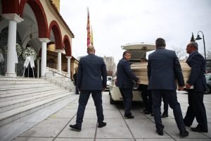 Στην κηδεία του 39χρονου βρέθηκε και η πρόεδρος του συλλόγου οικογενειών των θυμάτων της τραγωδίας των Τεμπών, Μαρία Καρυστιανού .