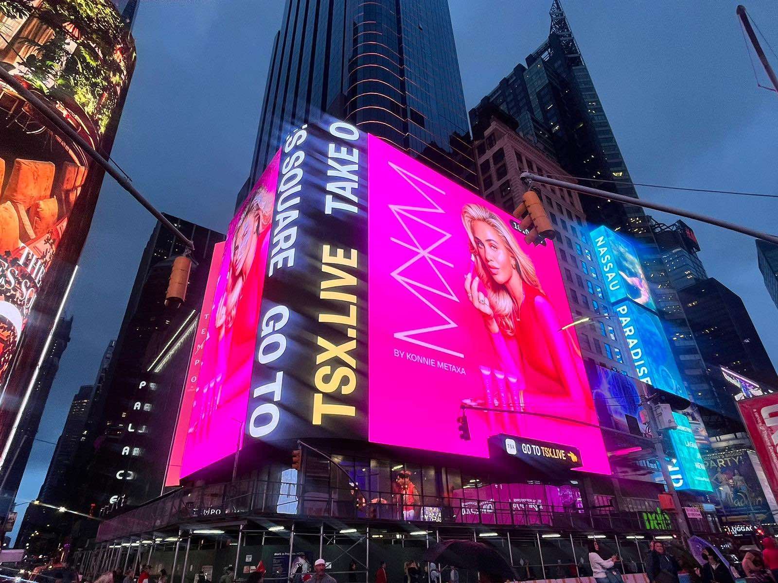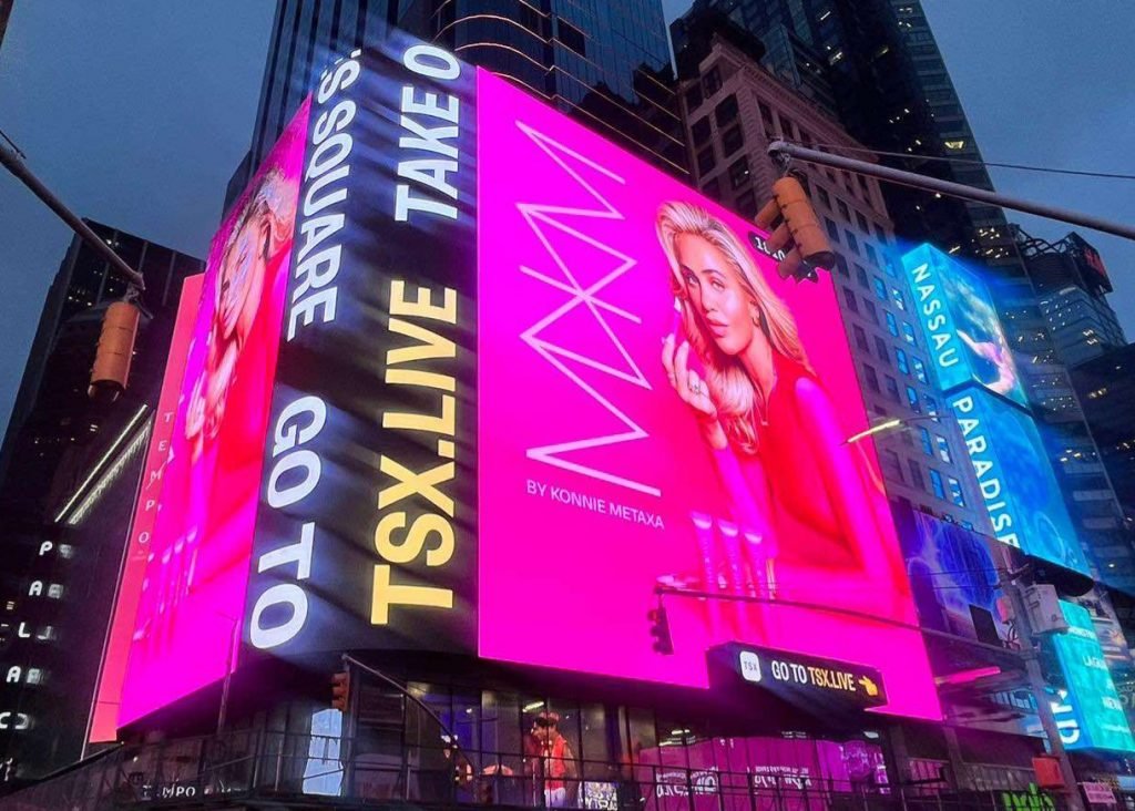 Σε πελάγη ευτυχίας, πλέει η Konnie Metaxa, η οποία, άκρως συγκινημένη, θέλησε να μοιραστεί την χαρά της, και με τους διαδικτυακούς της φίλους, λίγη ώρα μετά, αφού τεράστια αφίσα, με το πρόσωπό της, κρατώντας στα χέρια της ένα lip gloss, βρέθηκε να φιγουράρει, σε δύο τεράστια σημεία, στο billboard, το κέντρο του κόσμου, στην Times Square της Νέας Υόρκης.