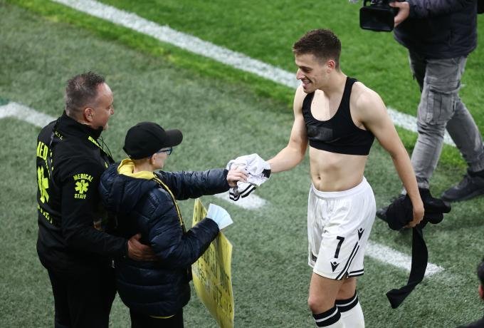 Επιθυμία του μικρού φίλου της ΑΕΚ ήταν να αποκτήσει την φανέλα του Γιάννη Κωνσταντέλια και φυσικά ο Έλληνας άσος δεν θα μπορούσε να του χαλάσει το χατίρι. Πήγε προς το μέρος του, του χάρισε τη φανέλα του, φωτογραφήθηκε μαζί του και του χάρισε έναν ακόμα λόγο για να χαμογελά.