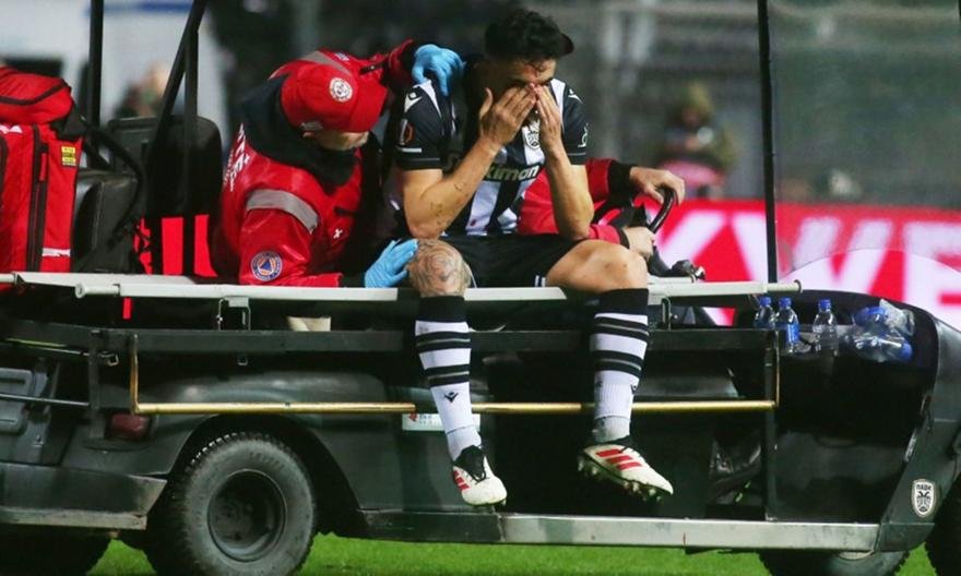 Ο Έλληνας στόπερ τραυματίστηκε μετά από σφοδρή σύγκρουση με τον Κοτάρσκι, με αποτέλεσμα να αποχωρήσει με ειδικό όχημα από τον αγωνιστικό χώρο.