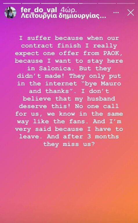 Μόλις ο Μαουρίσιο υπέγραψε κι ανακοινώθηκε απ’ τον Παναθηναϊκό, η σύζυγός του έκανε ανάρτηση στα social media. Εκεί, η Φερνάντα έγραψε πως μόνο αυτή και η οικογένειά της ξέρουν τι πέρασαν τους προηγούμενους μήνες. Λόγια που από πολλούς ερμηνεύτηκαν και κρίθηκαν αρνητικά. Μέχρι και αχάριστα προς τον ΠΑΟΚ!