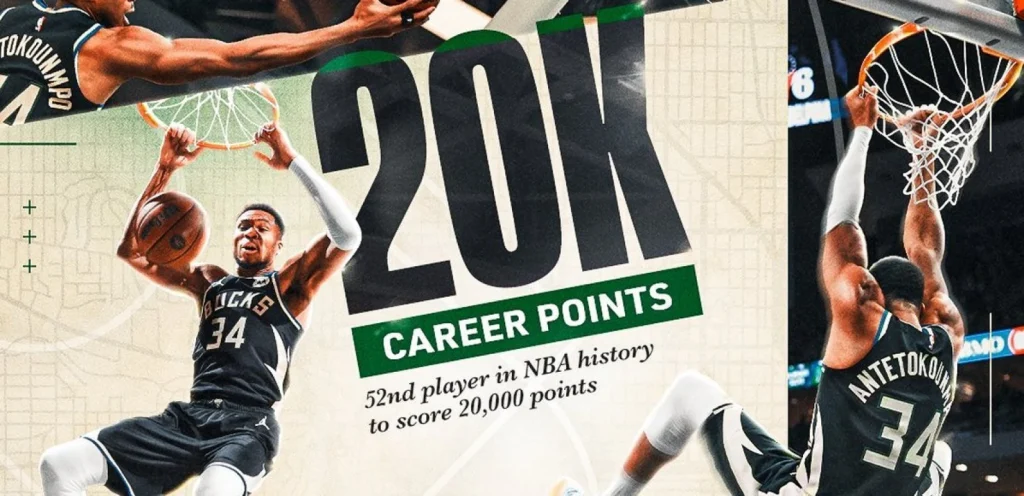Ο Έλληνας σταρ σημείωσε 32 πόντους, ξεπέρασε τους 20.000 στο πρωτάθλημα κι έγινε ο 52ος παίκτης που καταφέρνει να ξεπεράσει αυτό το φράγμα. Μάλιστα είναι ο έκτος νεότερος μετά τους ΛεΜπρόν Τζέιμς, Κέβιν Ντουράντ, Κόμπι Μπράιαντ, Γουίλτ Τσάμπερλεϊν και Μάικλ Τζόρνταν.