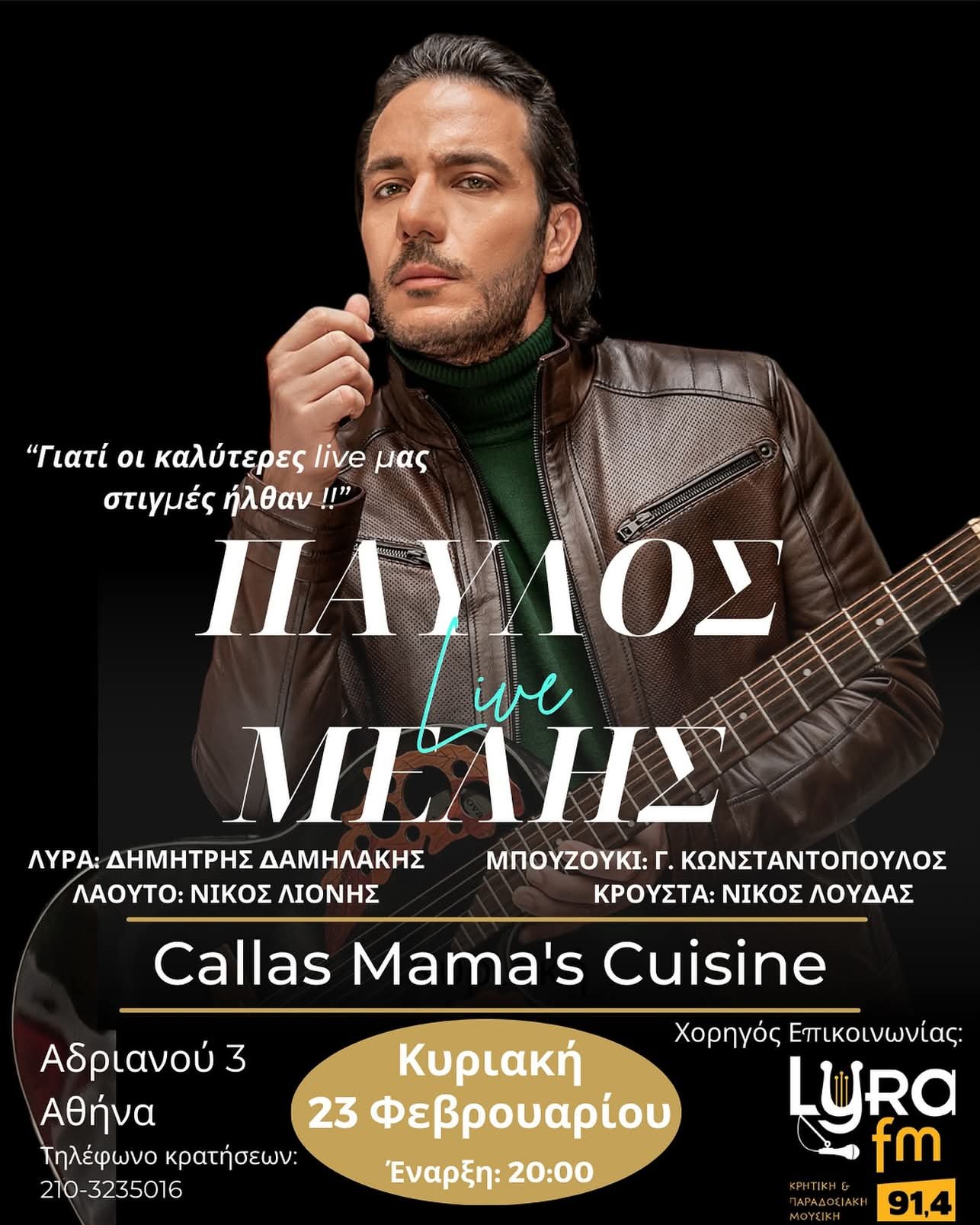 Με ένα μουσικό πρόγραμμα που περιλαμβάνει όλα τα τραγούδια που αγαπάει και αγαπάμε, ο Παύλος Μελής μάς περιμένει την Κυριακή 23 Φεβρουαρίου, στο «Callas Mama’s Cuisine», το all day hot spot, στην καρδιά της Αθήνας.