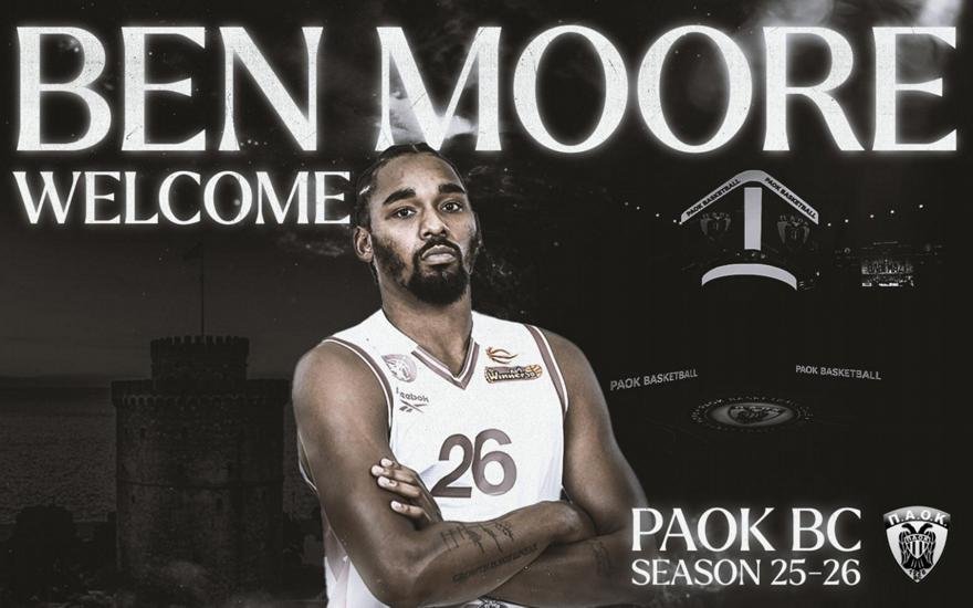 «Η ΚΑΕ ΠΑΟΚ mateco ανακοινώνει τη συμφωνία με τον Αμερικανό καλαθοσφαιριστή Ben Moore για την αγωνιστική περίοδο 2025-26. Καλωσορίζουμε τον Ben Moore στη μεγάλη οικογένεια του ΠΑΟΚ.
